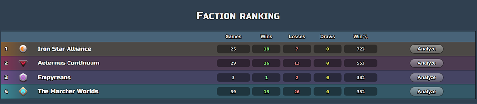 A: We meticulously reviewed every single model, weapon, cypher and cortex and assessed where they fit into the balance of the game, particularly in a post Kickstarter 3 environment. Generally we tried not to nerf things unless they were causing problems for either the external balance between factions or with list building. We noticed that Marcher Worlds were consistently falling behind, meanwhile the Iron Star Alliance was generally outperforming the other factions, and this is reflected in their winrates on Longshanks (see below). Although we don’t have a ton of data on Empyreans, we still noticed that their design was warping the meta in a way that made certain options less viable.